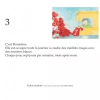 « Savez-vous qui coud les maillots des footballeurs ? C’est Florentine… Toute la journée, Florentine coud des maillots rouges avec des numéros blancs. Jusqu’au jour où elle coud un chat, puis une vache. Tout un monde se crée entre ses doigts. Florentine vit désormais heureuse. Elle n’est pourtant pas au bout de ses surprises…